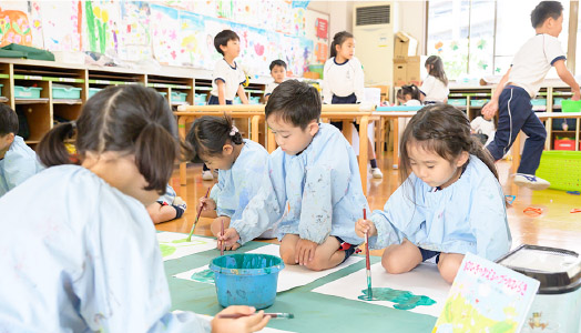 外部美術講師にお願いし、生活の中で体験したことや感じたことを、 色や形で自由に表現することにより、創造力の芽生えを引き出しています。