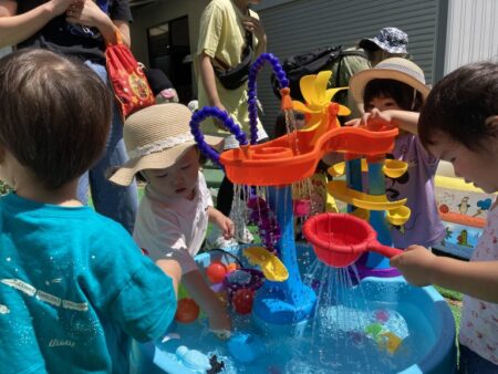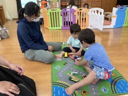 室内でブロックやままごと、車のおもちゃで遊んだ後に